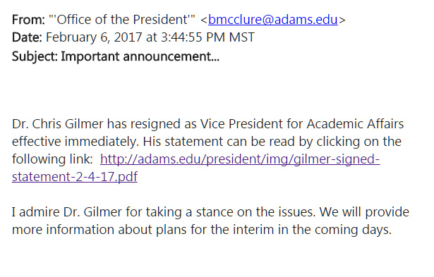 Until Dr. Gilmer’s resignation, AVPAA Doell reported to former VPAA Gilmer. Doell is noted by observers on campus as a personal friend of ASU President Beverlee McClure. Dr. Gilmer had significant relational issues with President McClure according to his statement: “The friendship which President McClure and I formed quickly and easily has unfortunately dissolved and has begun to affect the university in a negative way.”