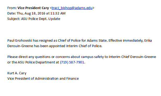 An email sent to all faculty and staff today confirmed that Adams State University (ASU) Police Chief Paul Grohowski resigned. Grohowski began serving with ASU PD in the spring of 2015. ASU has named Interim Chief Derouin-Greene to serve in this position. Grohowski’s resignation had long been anticipated by many in the Alamosa community as his house was for sale and many sources confirmed that Grohowski felt the Alamosa area was not a good fit.