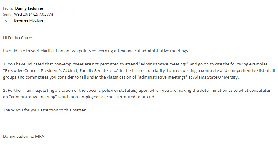 Ledonne shared the letter with Westword reporter Alan Prendergast, who published an article on October 19th titled, “Adams State bans from Campus Ex-Prof who Criticized Payscale.” To date, the article has been shared over 600 times on Facebook.
